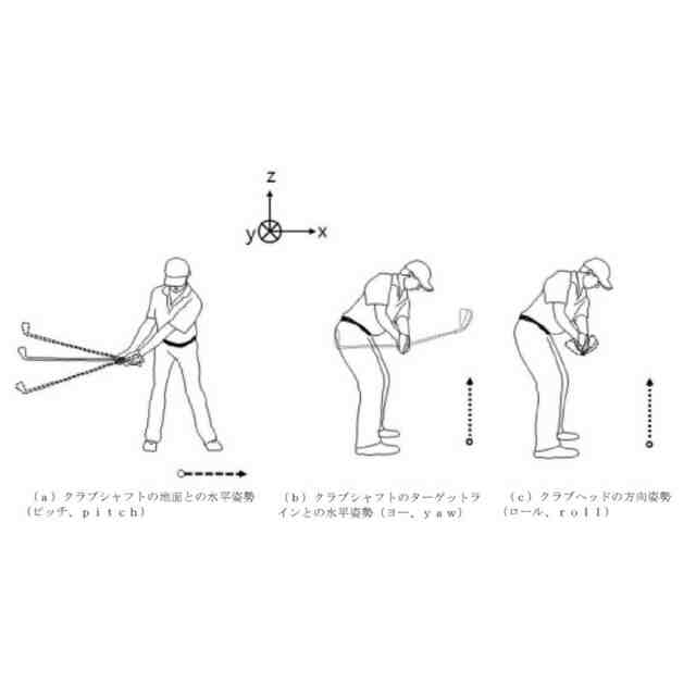 一方、図2を参照すると、テイクアウェイ動作が望ましく行われるか否かを点検するための要素としては、一般に、3種類の要素を使用する。すなわち、図2(a)においては、正面(前面)から使用者を眺めたときの様子であって、クラブシャフトが地面と水平をなすことを好適な姿勢とし、水平までの距離が短い(水平に達していない)場合は、手首の使用がほとんど行われておらず、水平を過ぎた場合は、手首のコーキングが予め行われた場合を示す。