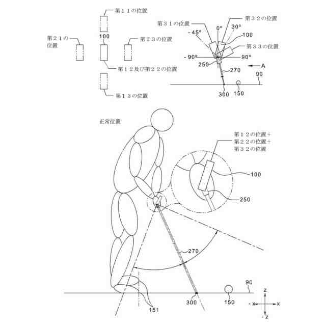 前記使用者の右側から使用者を眺めたときに、前記ヘッドが前記グリップよりも左側に位置する形状(使用者の後側にヘッドが移動)である第21の位置と、前記ヘッドが前記グリップと一致する形状である第22の位置と、前記ヘッドが前記グリップよりも右側に位置する形状(使用者の手前側にヘッドが移動)である第23の位置と、を定義し、