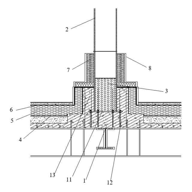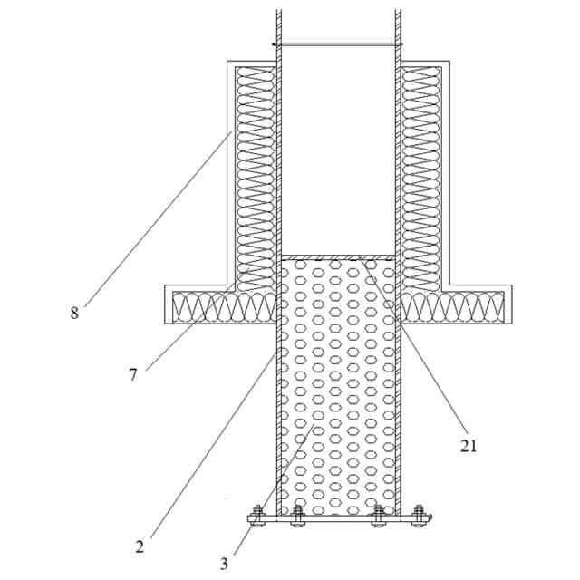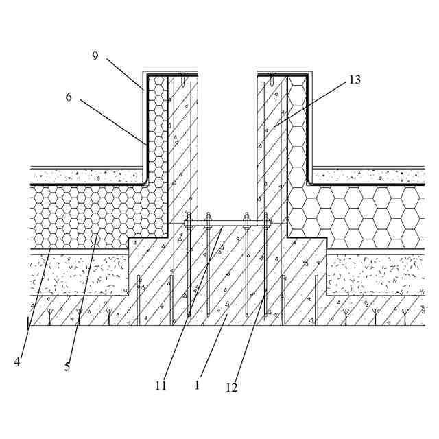 上記技術案の有益な効果は、以下のとおりである:太陽光発電鉄骨構造の土台の断熱省エネルギー施工は、コンクリート土台の断熱施工と鉄骨構造柱の柱脚の断熱施工という2つの部分に分けられ、コンクリート土台に2層の防水層が設置され、2つの防水層の中間に断熱層が設置されることにより、コンクリート土台の断熱防水効果を効果的に保証することができ、鉄骨構造柱の柱脚内に断熱モルタルが充填され、鉄骨構造柱と屋根の鋼鉄の梁との熱橋による重ね接続を効果的に行うとともに、鉄骨構造柱の柱脚の外周に柱脚断熱層を設置して、鉄骨構造柱の柱脚の断熱効果を効果的に保証し、安全で効果的であり、施工しやすく、ゼロカーボンビルの断熱省エネルギーという技術要件を保証し、施工進捗を早めにし、施工コストを削減する。