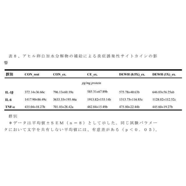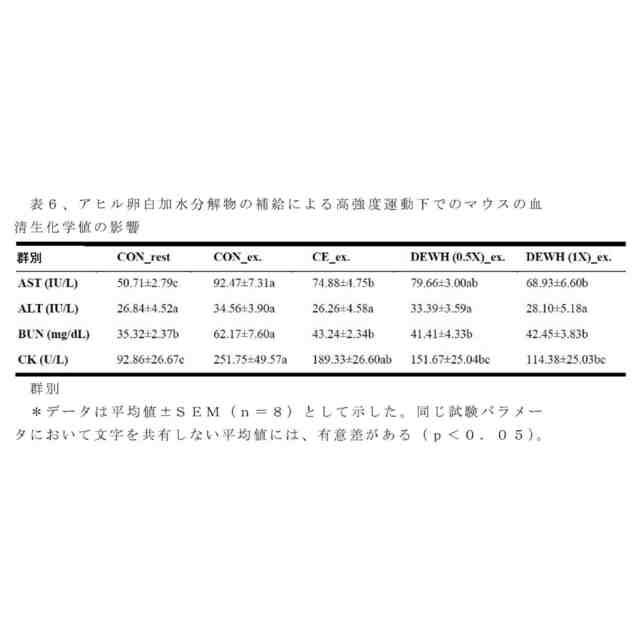 故に、本発明は、総疎水性遊離アミノ酸が総遊離アミノ酸含量の52%以上を占め、このうちの疎水性アミノ酸中の分岐鎖アミノ酸(branched chain amino acid、BCAAs)は総遊離アミノ酸含量の26%以上を占め、このうちのイミダゾール環を含むジペプチド(imidazole-ring dipeptide)含量は凍結乾燥卵白加水分解物粉末200mg/100g以上である卵白加水分解物を提供する。