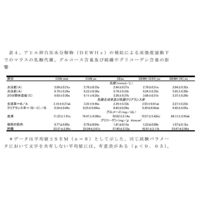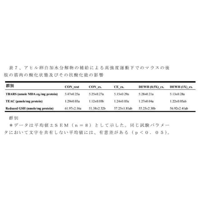 【解決手段】 本発明は、総疎水性遊離アミノ酸が総遊離アミノ酸含量の50%以上を占め、このうちの疎水性アミノ酸中の分岐鎖アミノ酸(branched chain amino acid、BCAAs)は総遊離アミノ酸含量の26%以上を占め、このうちのイミダゾール環を含むジペプチド(imidazole-ring dipeptide)含量は凍結乾燥卵白加水分解物粉末200mg/100g以上である卵白加水分解物を提供する。