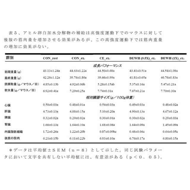 研究結果によりタンパク質、低分子ペプチド又はアミノ酸の補給は、筋線維の修復を助けるだけでなく、筋肉量の増加にも役立つため、より重要であるように見せていた。米国農務省の食品データベースによるとアヒル卵白の栄養価は、鶏卵白よりも高く、フィットネス時の栄養補給として、また筋肉量を増加するため一般的に使用されるホエイプロテインよりも栄養価がさらに高いとされている。