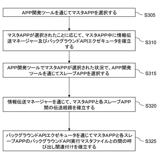 本発明の一実施形態では、APP開発ツールがマスタAPPを選択している状況でさらに、APP開発ツールを通じて第2スーパーAPPを選択し、そのうち第2スーパーAPPが複数の第2APPを含み、これらの第2APPの1つが第2スーパーAPPのマスタAPPであること、及び第2スーパーAPPを第1スーパーAPPにインポートし、第2スーパーAPPに含まれる第2APPを第1スーパーAPPのスレーブAPPとするステップを含み、またこのステップには、第1スーパーAPPの情報伝送マネージャーを通じて第1スーパーAPPのマスタAPPと第2スーパーAPPの各第2APPとの間の伝送経路を確立すること、及び第1スーパーAPPのバックグラウンドAPIエクゼキュータを通じて第1スーパーAPPのマスタAPPと第2スーパーAPPの各第2APPのバックグラウンドAPI実行マスタファイルと間の呼び出し関連付けを確立することを含む。