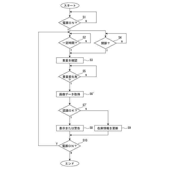 前記在庫情報として記憶された在庫の重量と、現在の秤上の収容物の重量とを比較し、重量に変化があった場合に、前記カメラを制御して収容室内を撮影し、画像データを受け取り、