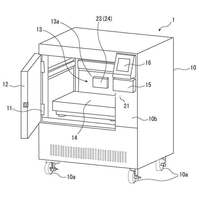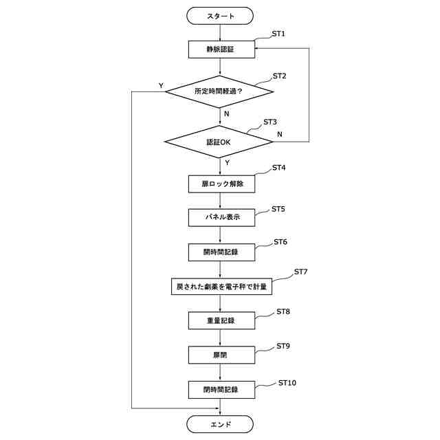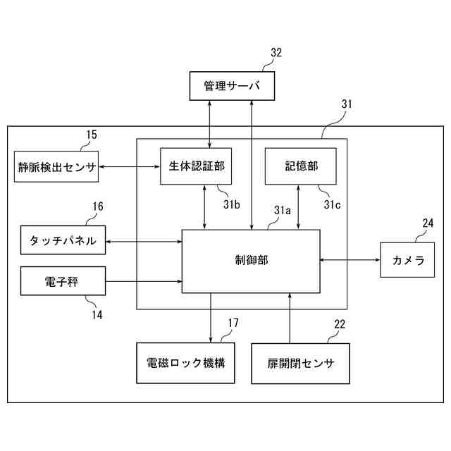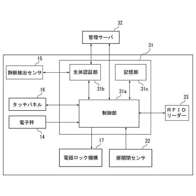 具体的には、特許文献1に記載のキャビネットは、筐体内に形成された収容室と、この収容室を開閉可能に設けられた扉と、扉の施錠および開錠を行うロック機構と、ロック機構の開錠動作を制御する制御部と、予め許可されたユーザの生体情報と生体センサにより読み取ったユーザの生体情報とのマッチング認証を行う生体認証部と、収容室内に載置された薬剤の重量を測定する電子秤とを備える。