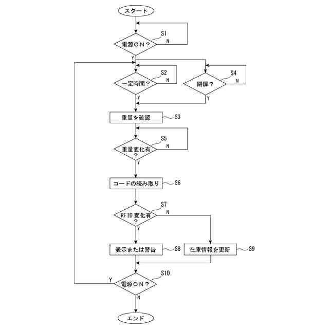 その後、前記在庫情報として記憶された識別コードと前記ICタグから読み取った識別コードとを比較して変化があった場合に、前記収容物の入れ替えがあったものと判断し、その旨の画面表示または照明や音声による警告を行うとともに、前記RFIDリーダーを介して読み取った識別コードに基づいて在庫情報を更新する、