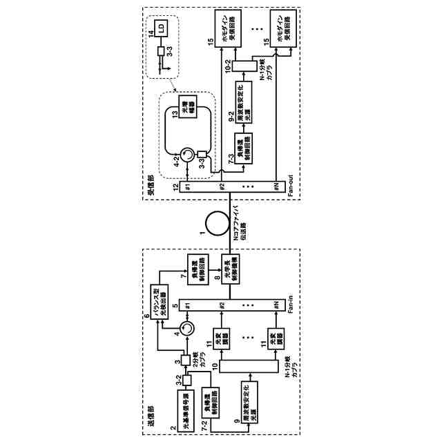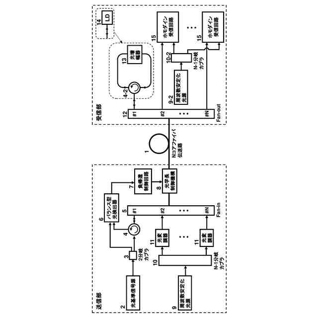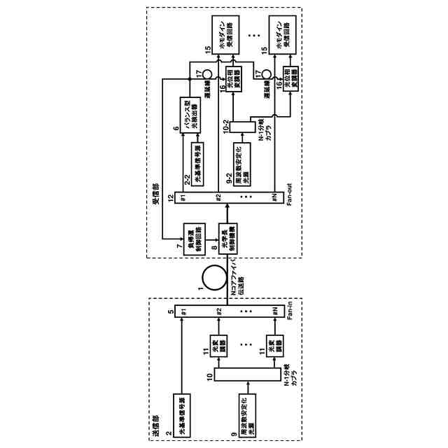 公開番号2025171981 公報種別公開特許公報(A) 公開日2025-11-20 出願番号2025069054 出願日2025-04-18 発明の名称空間多重光伝送システムおよびマルチコアファイバ 出願人国立大学法人東北大学 代理人個人 主分類H04B 10/2507 20130101AFI20251113BHJP(電気通信技術) 要約【課題】トーン信号を用いず、受信回路内に位相揺らぎに対する補償回路を一切必要としない、マルチコアファイバを用いた空間多重光伝送システムを提供する。 【解決手段】複数のコアのうちのいずれか1つのコアを、マルチコアファイバ中で生じる光学長揺らぎを補償するための光学長制御用チャンネルとして使用する。光学長制御用チャンネルにより光学長制御を施したマルチコアファイバ中の他のコアを用いて、コヒーレント光通信あるいは量子通信・量子鍵配送を行う。 【選択図】図1 特許請求の範囲【請求項1】 複数のコアを有するマルチコアファイバを用いた空間多重光伝送システムにおいて、 前記複数のコアのうちのいずれか1つのコアを、前記マルチコアファイバ中で生じる光学長揺らぎを補償するための光学長制御用チャンネルとして使用し、前記光学長制御用チャンネルにより光学長制御を施した前記マルチコアファイバ中の他のコアを用いて、コヒーレント光通信あるいは量子通信・量子鍵配送を行うことを 特徴とする空間多重光伝送システム。 続きを表示(約 1,200 文字)【請求項2】 前記コヒーレント光通信あるいは前記量子通信・量子鍵配送の送信光源および局発光源として、同一の光周波数を有する光源を使用し、さらに前記光学長制御を施した前記マルチコアファイバを光伝送路として利用することを特徴とする請求項1記載の空間多重光伝送システム。 【請求項3】 前記マルチコアファイバとして、クロストークが極めて小さいマルチコアファイバを用いることにより、前記コヒーレント光通信と前記量子通信・量子鍵配送とをそれぞれ異なるコアで互いに干渉することなく同時に実施できることを特徴とする請求項1記載の空間多重光伝送システム。 【請求項4】 前記マルチコアファイバ中で生じる前記光学長揺らぎを検出するための光基準信号源として、光格子時計に周波数安定化した単一周波数光源を利用することを特徴とする請求項1記載の空間多重光伝送システム。 【請求項5】 前記光基準信号源の位相に、前記コヒーレント光通信あるいは前記量子通信・量子鍵配送の送信光源および局発光源の位相を、負帰還制御回路により同期することを特徴とする請求項4記載の空間多重光伝送システム。 【請求項6】 前記マルチコアファイバの前記光学長制御用チャンネルとして使用するコアと、前記量子通信・量子鍵配送を行うコアとを分離するクロストーク抑制構造が設けられていることを特徴とする請求項1記載の空間多重光伝送システム。 【請求項7】 前記マルチコアファイバの前記量子通信・量子鍵配送を行うコア以外の少なくとも一つのコアの、少なくとも一部分に希土類元素が添加されていることを特徴とする請求項1記載の空間多重光伝送システム。 【請求項8】 前記量子通信・量子鍵配送を行うコア以外の少なくとも一つのコアに隣接するサイドポンピング用ファイバを備えることを特徴とする請求項7記載の空間多重光伝送システム。 【請求項9】 前記マルチコアファイバ中で生じる前記光学長揺らぎとして、温度変化もしくは圧力変化に伴う低速な揺らぎ、あるいは光ファイバ中のガラス分子の熱振動に伴う高速な揺らぎ、あるいはそれら両方の揺らぎを、光ファイバストレッチャーあるいは光変調器を用いた負帰還制御により補償することを特徴とする請求項1及至8のいずれか1項に記載の空間多重光伝送システム。 【請求項10】 複数のコアを有するマルチコアファイバであって、 前記マルチコアファイバ中で生じる光学長揺らぎを補償するための光学長制御用チャンネルとして、光基準信号の伝送に使用する1つのコアと、前記光基準信号より10 -6 以下の光強度の微弱な信号の伝送に使用する他のコアとを分離するクロストーク抑制構造が設けられていることを 特徴とするマルチコアファイバ。 (【請求項11】以降は省略されています) 発明の詳細な説明【技術分野】 【0001】 本発明は、空間多重光伝送システムおよびマルチコアファイバに関するものである。 本願は、2024年5月10日に、日本に出願された特願2024-077233号に基づき優先権を主張し、その内容をここに援用する。 続きを表示(約 2,700 文字)【背景技術】 【0002】 基幹光伝送網の大容量化に向け、多値コヒーレント光伝送技術の導入による波長分割多重(WDM:Wavelength Division Multiplex)伝送システムの周波数利用効率の拡大に高い関心が寄せられている。波長分割多重伝送システムでは、一般に、送信部で生成される光キャリア信号と受信部で生成される局発光信号とがそれぞれ異なる光周波数をもち、それらが独立に温度ドリフトなどにより変動する関係にある。そのため、受信回路内のデ