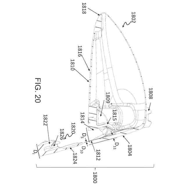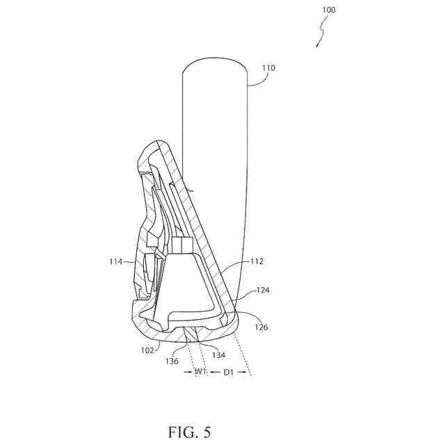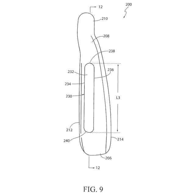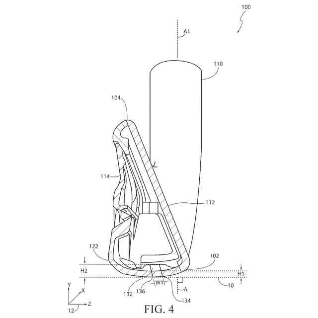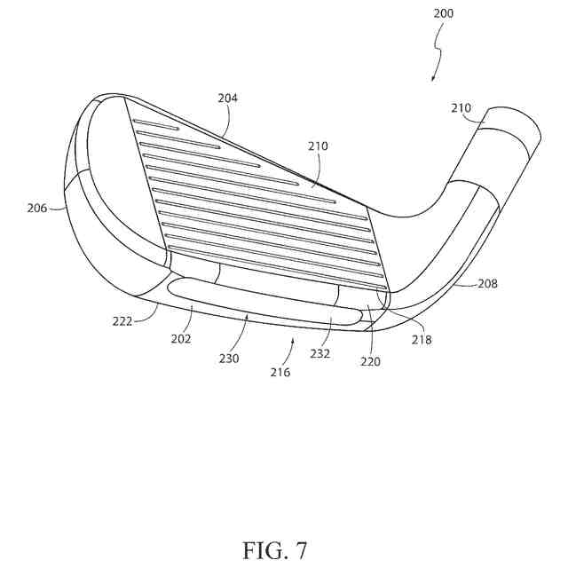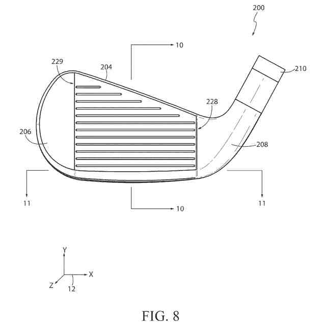 概して、スロットは、約20mm~約85mmの長さを有することができる。スロットは、約1mm~約13mmの幅を有することができる。この発明この発明の実施例では、スロットは、打撃フェースの領域内に(x方向に)維持される。この発明この発明の別の実施例では、スロットはゴルフクラブヘッドのトウ部分に入ることができる。この発明この発明の別の実施例では、スロットは、ゴルフクラブヘッドのトウ部分内に上向きに延在することができる。別の実施例では、スロットは、トウ部分内に上向きに延在し、ゴルフクラブヘッドの後部部分に向かって後方に湾曲することができる。