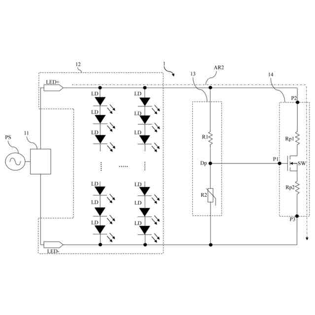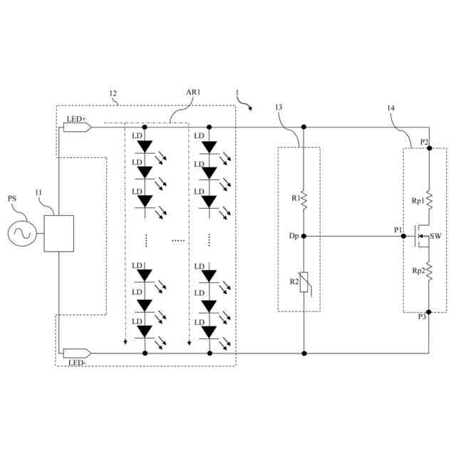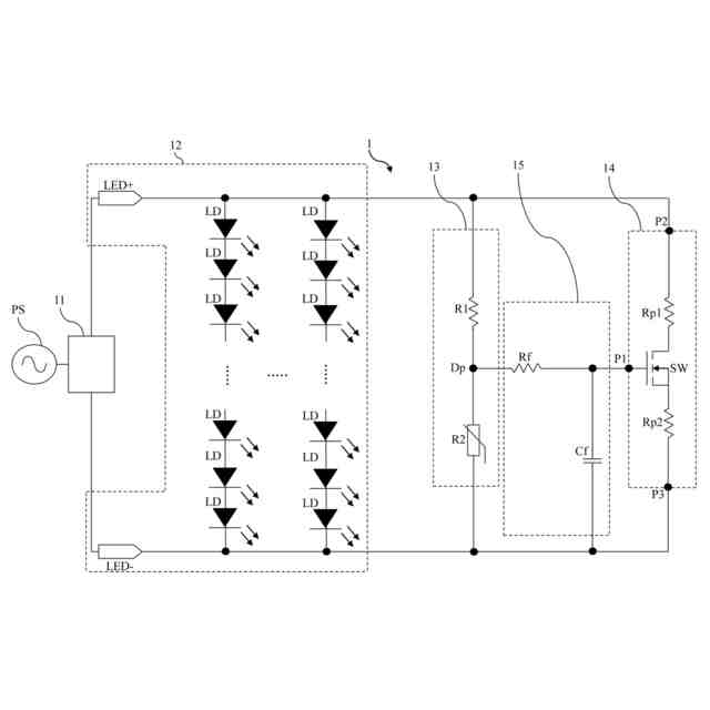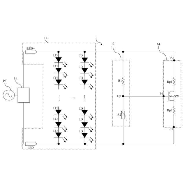発光ダイオード照明装置には、省エネ、高効率、長寿命など多くの利点がある。しかし、従来の発光ダイオード照明装置には、依然として更に改良すべき欠点がいくつか残っている。例えば、発光ダイオード照明装置のうちの1つの発光ダイオードが故障すると、発光ダイオードと直列又は並列に接続されている他の発光ダイオードの電流が増加し、光源モジュール全体の温度が上昇する。このように、発光ダイオード照明装置は、高温により光源モジュール全体の損傷を引き起こし易い。一般的に、照明装置の製造業者は、上記の問題を改善するために、次の解決策を採用する。(1)光源モジュールの電圧をシングルチップマイコンで検出し、電圧が変化する時に適切な調整を行う。しかし、この解決策はコストが高く、回路構造が複雑である。(2)電圧ツェナーダイオードを介して光源モジュールの電圧を検出し、電圧が変化した時に適切な調整を行う。しかし、この解決策では誤差が大きく、正確な検出を効果的に達成することができない。(3)コンパレータ回路を介して光源モジュールの電圧を検出する。しかし、この解決策はコストが高く、回路構造が複雑である。