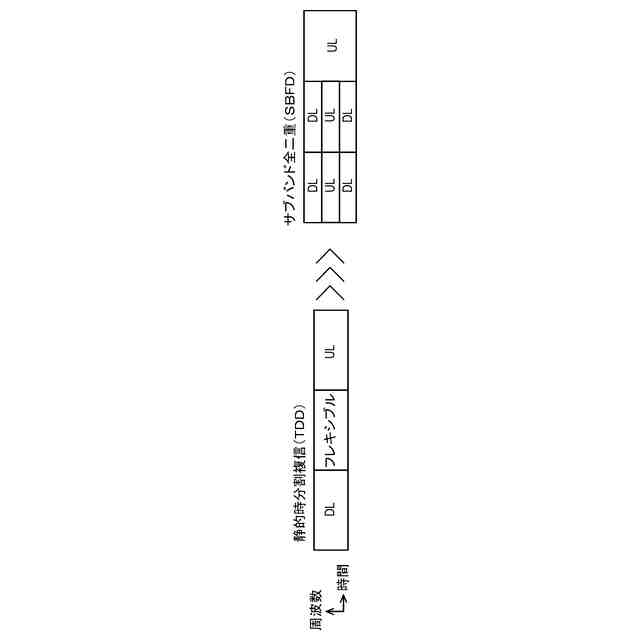 図1は、静的時分割複信(TDD)とサブバンド全二重(SBFD)を示す概略図である。図1を参照し、デュプレックス操作では、新しい時間リソースタイプであるSBFDが導入される。SBFDでは、ダウンリンク(DL)サブバンドとアップリンク(UL)サブバンドが同じシンボルに割り当てられる。但し、時分割複信(TDD)では、DL帯域とUL帯域は同じシンボルに割り当てられない。