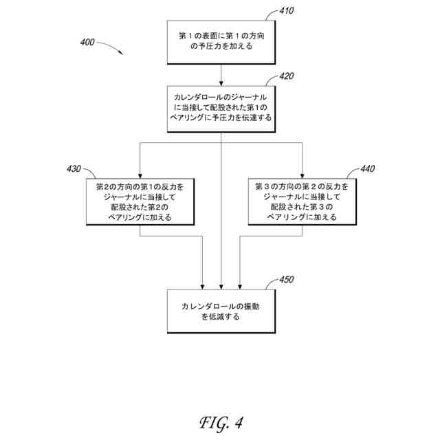 いくつかの実施形態では、本方法は、カレンダロールの振動を低減することを含む。いくつかの実施形態では、予圧力は少なくともおよそ100kNである。いくつかの実施形態では、第1の方向は重力と同じ方向におけるものである。いくつかの実施形態では、第1の反力は、垂直成分と水平成分とを含む。いくつかの実施形態では、第2の反力は、垂直成分と水平成分とを含む。いくつかの実施形態では、本方法は、第1のベアリング、第2のベアリング、および第3のベアリングの遊びを低減することを含む。