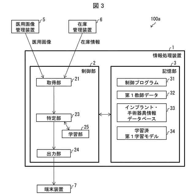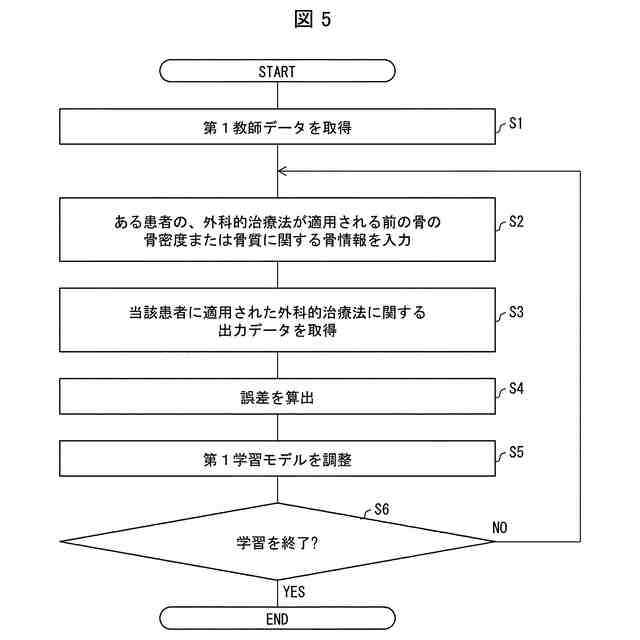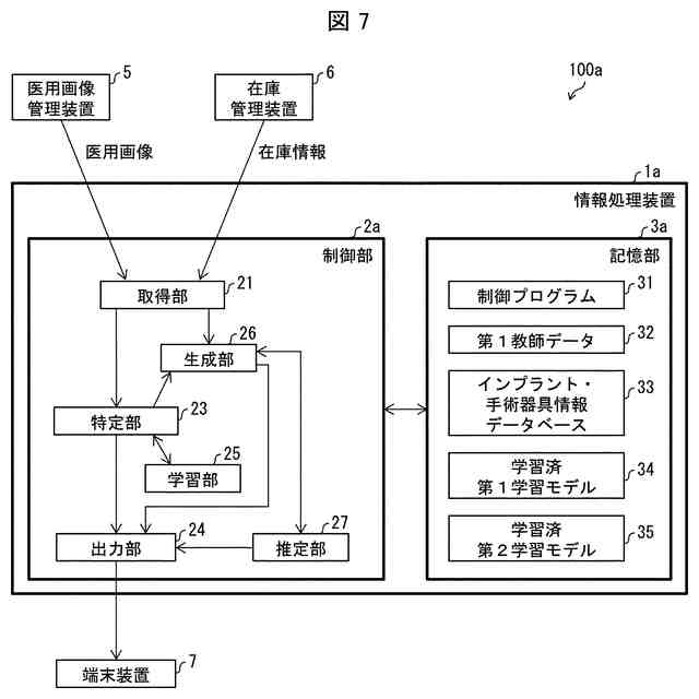 複数の学習対象者の各々の、インプラント埋設術を含む外科的治療法が適用される前の骨の骨密度および骨質の少なくともいずれかに関する骨情報、形状的特徴、および該骨に適用された外科的治療法に関する治療情報を含む第1教師データを用いて学習された第1学習モデルを有する特定部と、