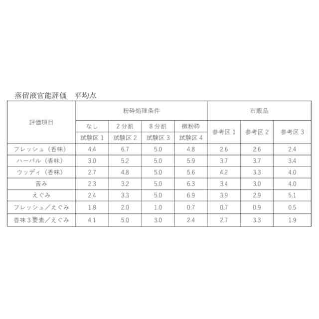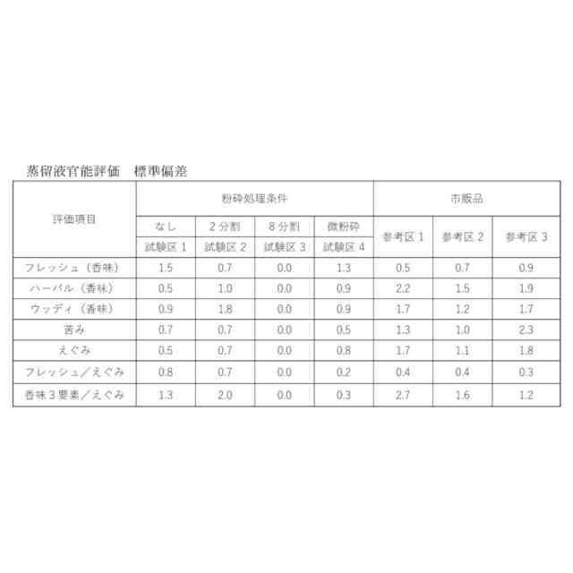 従って、本発明は、蒸留液中のえぐみを抑制しながらフレッシュな香味、ハーバルな香味、およびウッディな香味を好適な強度に制御された、ジュニパーベリーを原料として使用した蒸留酒の製法、該製法によって得られる蒸留酒、該蒸留酒を含有するアルコール飲料を提供する。