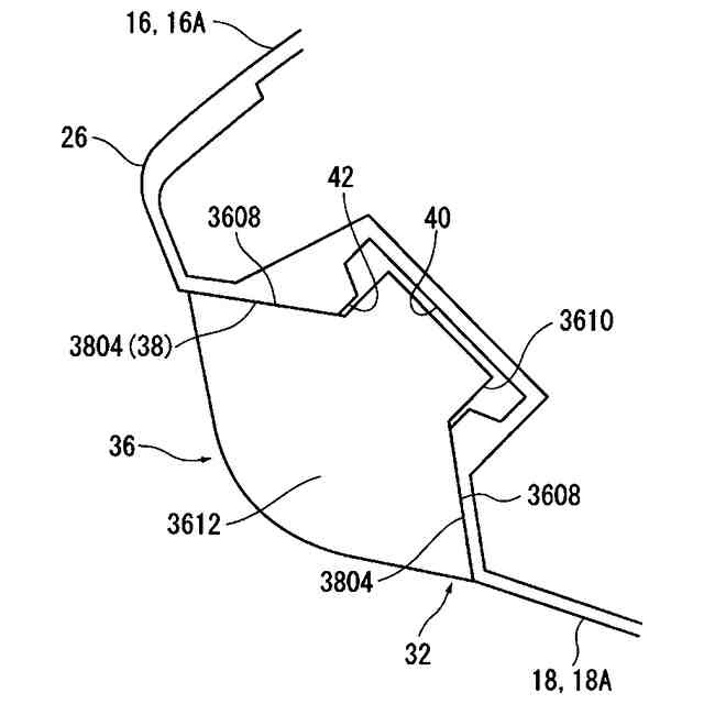 図1、図2に示すように、サイド部20は、クラウン部16とソール部18の間でフェース部14のトウ22側縁とヒール24側縁との間をフェースバック26を通って延在している。