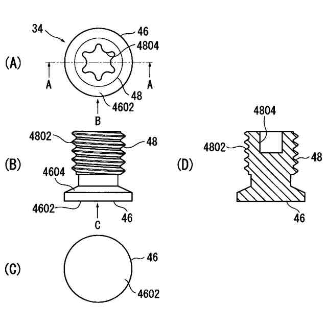 (A)はねじ部材の平面図、(B)は(A)のB矢視図、(C)は(B)のC矢視図、(D)は(A)のA-A線断面図である。