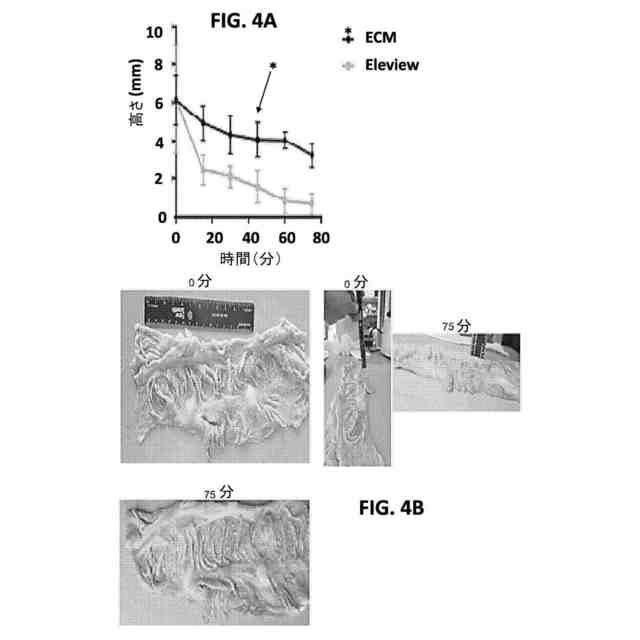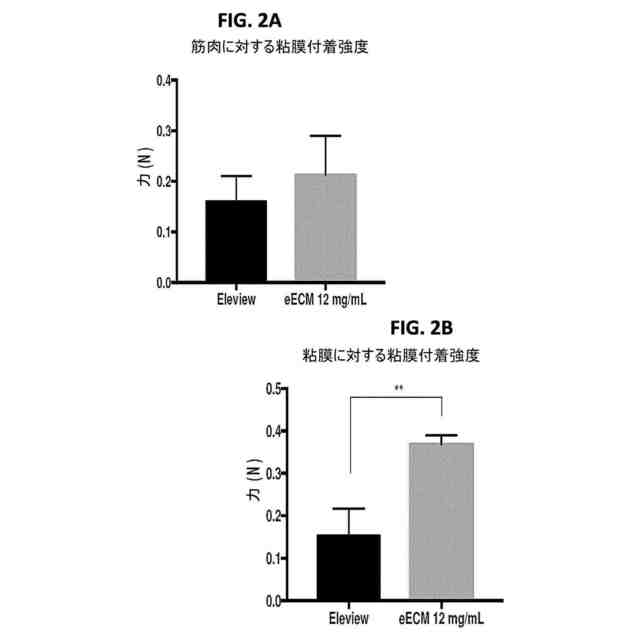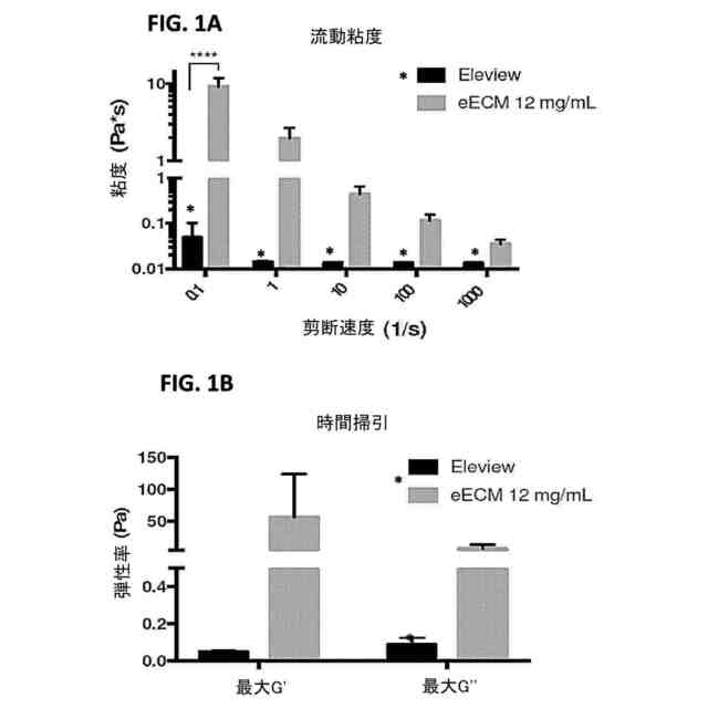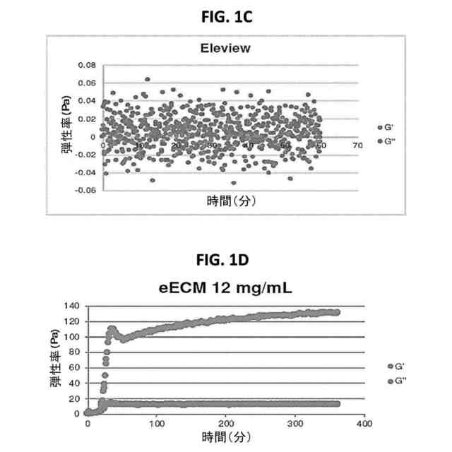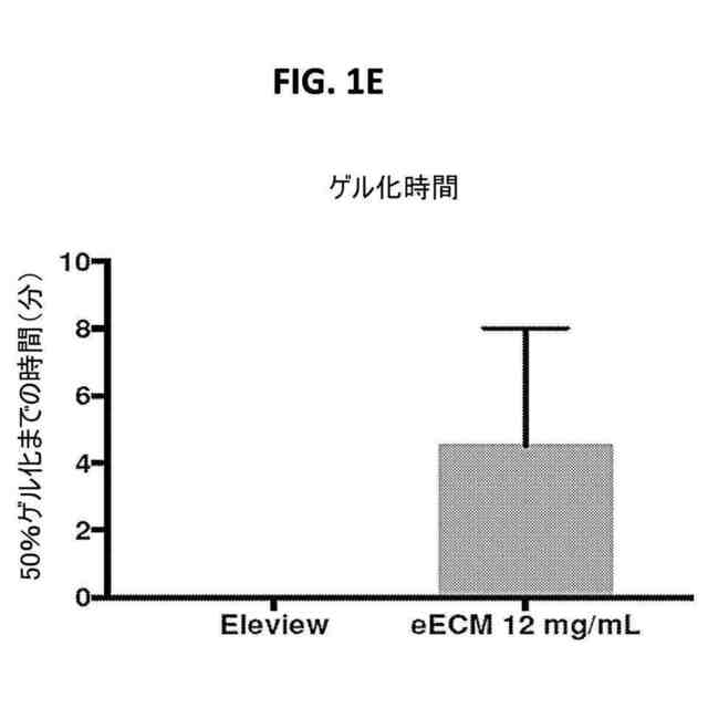 図1A~1Eは、粘弾性特性を示す図である。ELEVIEW(商標)および食道(eECM)12mg/mLの粘度プロファイルを、10℃において剪断速度を増加させながら(0.1~1000 1/s)試験した(A)。温度を37℃まで急速に上昇させて、ゲル化を誘導し、最大貯蔵(G’)および損失弾性率(G”)を測定した(B)。時間掃引の代表的なグラフがELEVIEW(商標)(C)および12mg/mLのeECMヒドロゲル(D)に関して示される。50%ゲル化までの時間は、eECM 12mg/mLに関しては測定したが、ELEVIEW(商標)に関しては、ELEVIEW(商標)がゲル化しなかった(時間掃引試験中G”>G’)ため、測定することができなかった(E)。