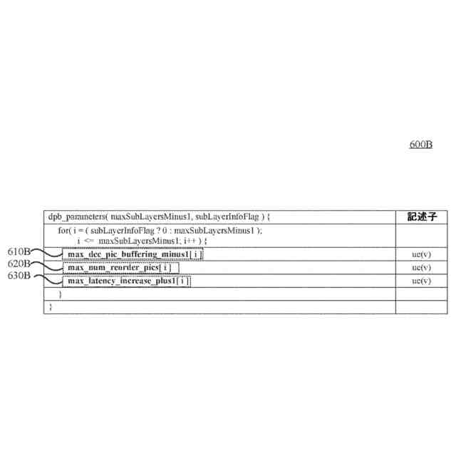 [0005] いくつかの実施形態では、この方法は、符号化映像シーケンス(CVS)が、等しい数の復号化ピクチャバッファ(DPB)パラメータシンタックス構造と出力レイヤセット(OLS)とを有するかどうかを判定すること、及びCVSが、等しい数のDPBパラメータシンタックス構造とOLSとを有することに応答して、対応するOLSに当てはまるDPBパラメータシンタックス構造の、VPS内のDPBパラメータシンタックス構造のリストに対するインデックスを指定する第1のDPBシンタックス要素をシグナリングすることなく、ビットストリームを符号化することを含む。
