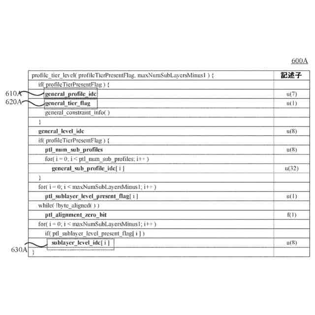 [0008] いくつかの実施形態では、この方法は、PTL関連情報を指定する1つ以上のプロファイル/ティア/レベル(PTL)シンタックス要素を符号化すること、及びビットストリームの映像パラメータセット(VPS)又はシーケンスパラメータセット(SPS)内で可変長を有する1つ以上のPTLシンタックス要素をシグナリングすることを含む。