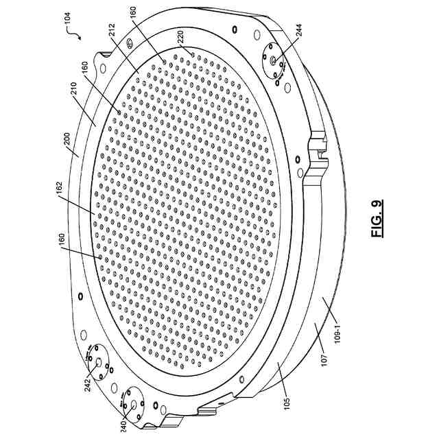 円盤状であり、前記第1のコンポーネントの前記孔の第1のセットと整列している第1の貫通孔を含み、上面と、側面と、底面であって前記円筒部分の反対側で前記第1のコンポーネントの前記円盤状部分に取り付けられた、前記第1のコンポーネントの前記孔の第2のセットと流体連通しており、かつ前記第1のコンポーネントの前記孔の第1のセットとは別個のものであるプレナムを画定する底面と、を有し、前記上面が、周縁に沿って前記上面の両端にある一対の円弧状溝を含み、かつ前記一対の円弧状溝の間に延びる複数の溝を含む、第2のコンポーネントと、