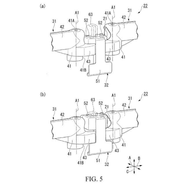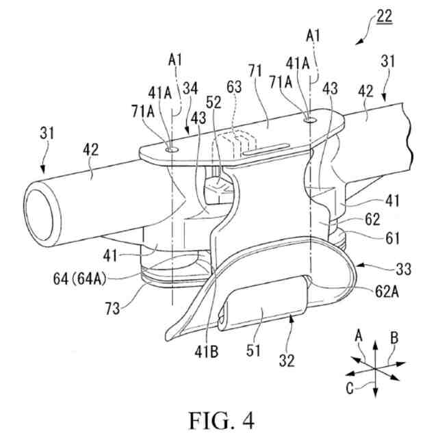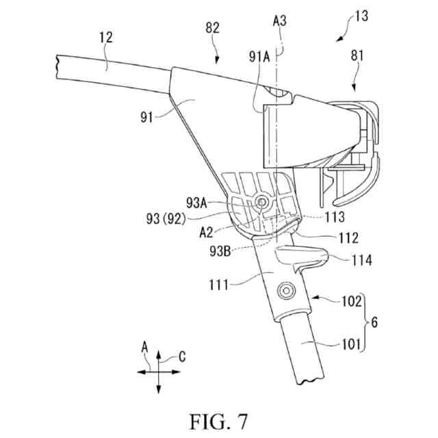 前記筐体及び2つの前記管体取付部材に対して移動可能なラッチ部材であって、前記ラッチ部材が、2つの前記折畳回動軸間の間隙に配置されたラッチ部を有し、前記ラッチ部材が、前記ラッチ部を2つの前記ラッチ突起部と係合及び係合解除するために移動可能である、ラッチ部材と、