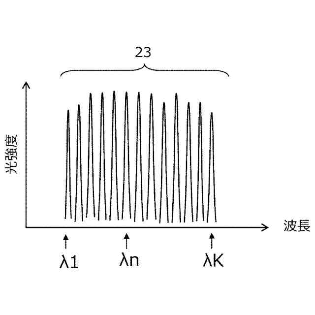 図5は、結合するレーザビームの本数がK本の場合(Kは4以上の整数)における第3波長結合ビームのスペクトルを模式的に示すグラフである。