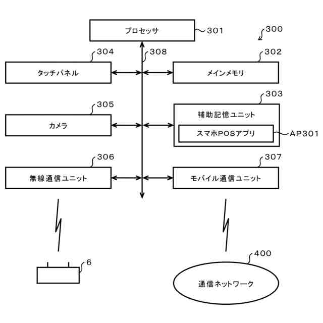 ユーザ端末300は、取引システムを利用した買い物を店舗にて行う客のためのユーザインタフェースとして機能する情報通信端末である。ユーザ端末300は、店舗システム100と無線通信する機能と、通信ネットワーク400と無線通信する機能とを備える。ユーザ端末300としては、スマートフォン又はタブレット端末等のデータ通信機能を備えた通信端末が利用できる。ユーザ端末300は、客により所有されていてもよいし、店舗にて客に貸与されてもよい。