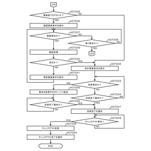 登録された前記商品の代金を前記客に決済させるための決済処理での決済の対象となる前記商品に、販売に際して店員による確認が必要となる商品が含まれる場合に、前記端末における操作により指定されるデータを取得し、