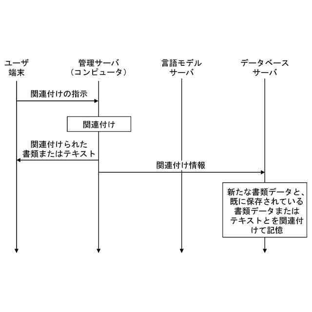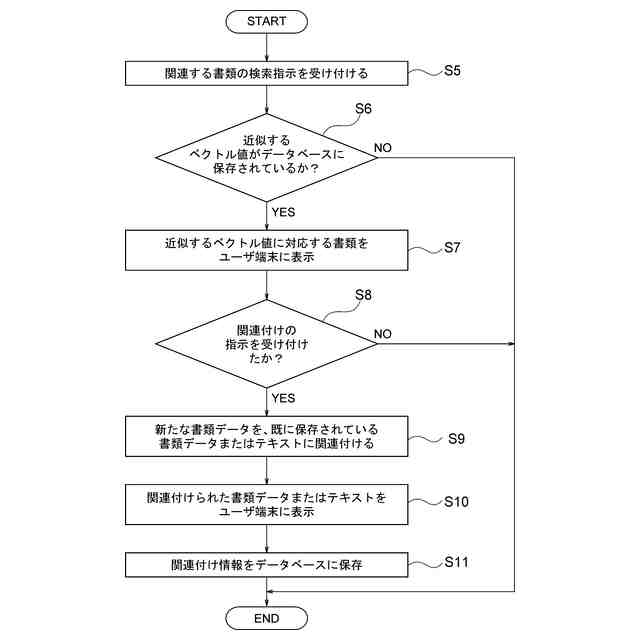 【解決手段】ベクトル化手段26は、テキスト抽出手段24により抽出されたテキストをベクトル化することにより多次元空間内での大きさと向きを持つ量であるベクトル値を取得し、ベクトル値保存手段28は、取得されたベクトル値を、受け付けた書類データまたはこの書類データから抽出されたテキストに関連付けてデータベース(記憶部40やデータベースサーバ80)に保存させる。関連付け手段30は、新たに受け付けた書類データを、この書類データから取得されたベクトル値と、データベースに既に保存されているベクトル値とに基づいて、データベースに既に保存されている書類データまたはテキストに関連付ける。