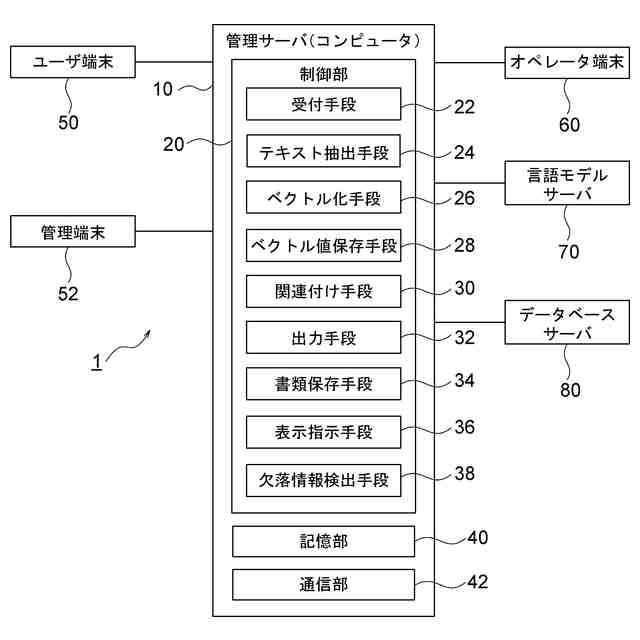 前記受付手段が新たに受け付けた書類データの一部項目の情報が欠落していると前記欠落情報検出手段により判定された場合に、前記欠落情報検出手段は、前記受付手段が新たに受け付けた書類データと、前記関連付け手段によりこの書類データが関連付けられた前記データベースに既に保存されている書類データやこの書類データのテキストとに基づいて前記受付手段が新たに受け付けた書類データの欠落情報を演算する旨の指示を大規模言語モデルに入力することによって当該大規模言語モデルにより前記受付手段が新たに受け付けた書類データの欠落情報の演算を行わせることを特徴とする。