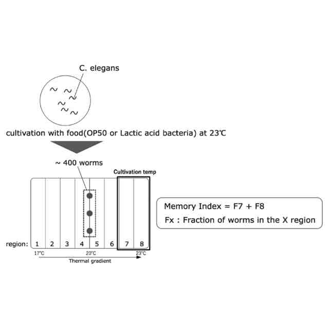 発明者らの過去のレーザーによるニューロンの破壊実験から、温度走性行動に必要なニューロンが明らかにされており、温度走性行動はきわめてシンプルな神経回路を基盤とすることが知られている(Nature, 376, 344-348 (1995))。また、発明者らの研究グループは、温度記憶が形成される過程をゲノムワイドなマイクロアレイ解析、分子遺伝学的な手法とイメージング技術により解析した。その結果、C. elegansは飼育温度を記憶する際に、転写因子であるHSF-1を介して周囲の温度を全身で受容していることを見い出した。さらに、この温度の受容は遺伝子の発現変化をひき起こし、その結果、温度シグナルは女性ホルモンであるエストロゲンを介して神経回路の温度受容ニューロンであるAFDニューロンに記憶として蓄積されることが示された(Nat. Neurosci., 14, 984-92 (2011))。
