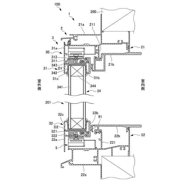 図1及び図2に示す縦すべり窓1は、樹脂複合サッシであり、室外側が金属のアルミニウムで構成され、室内側が樹脂で構成される。縦すべり窓1のアルミニウムの部分と樹脂の部分は互いに嵌合等によって接合されている。縦すべり窓1は、枠体2と、障子3と、開閉機構4と、リンク機構5と、を有する。縦すべり窓1は、枠体2及び障子3の縦枠23及び縦框33が見込方向に移動することで開閉される。