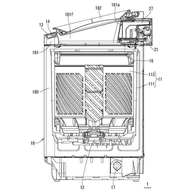 ここで、図1に示すように、給水部15がある側を前後方向の後側とすると、上下方向と前後方向とに直交する方向を左右方向とする。操作部13や表示部14は、洗濯物を投入する開口部181aを開閉するための蓋部182を挟んで、前側に存在する場合を例に説明するが、この位置に限定されるものではない。なお、左右方向は、前後方向の前側から見た状態を基準とする。