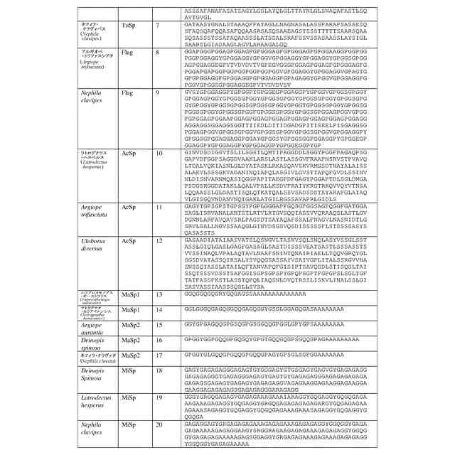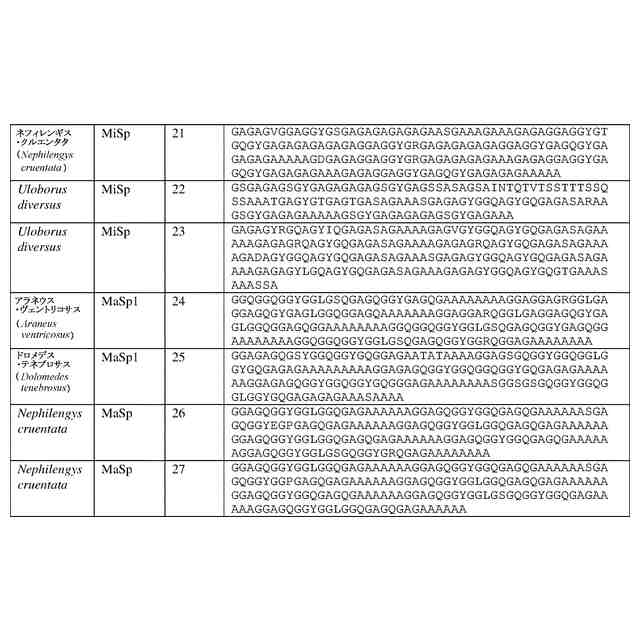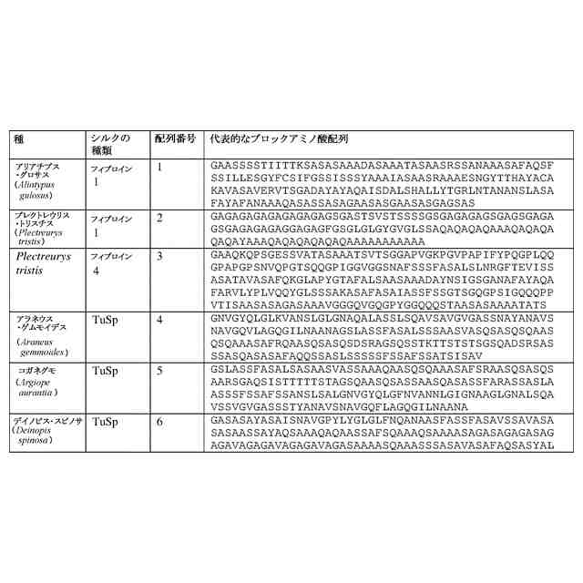 クモのシルクポリペプチドは、大きな(>150kDa、>1000アミノ酸)ポリペプチドであり、3つのドメイン:N末端非反復ドメイン(NTD)、反復ドメイン(REP)、及びC末端非反復ドメイン(CTD)に分けることができる。NTD及びCTDは、比較的小さく(それぞれ、約150、約100アミノ酸)、十分に研究が行われており、そして、ポリペプチドに対して、水安定性、pH感受性を付与し、また、凝集時には分子を整列させるものと考えられている。また、NTDは、強力な予測分泌タグを有しており、このものは、異種発現の間に除去されることが多い。天然ポリペプチドの約90%が反復領域であり、また、シルク繊維にそれぞれ強度と可撓性を付与する結晶領域とアモルファス領域へと折り畳まれている。