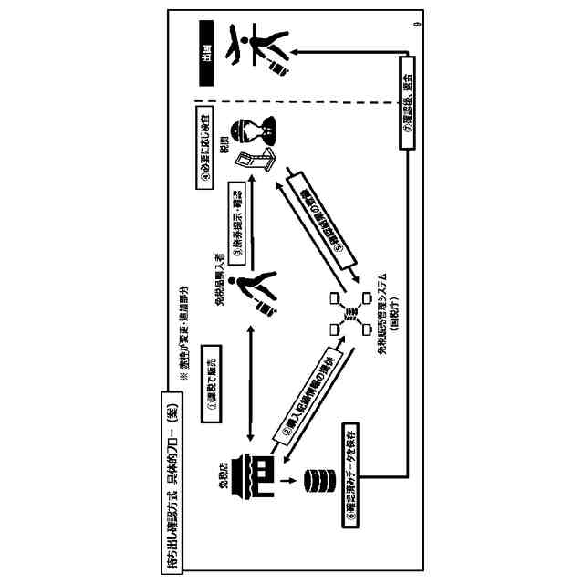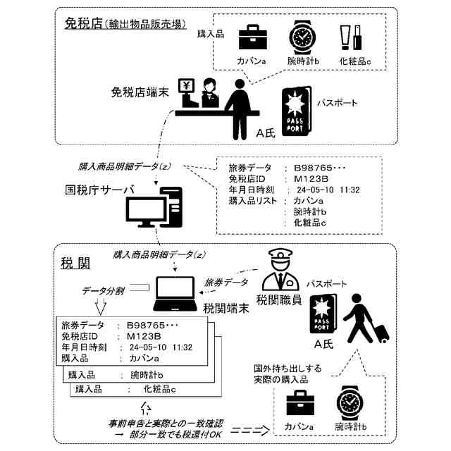 図3に示すように、輸出物品販売場(免税店)では、免税品が販売される毎に(1)購買商品明細データおよび購買者旅券データを含んだ免税販売データが国税庁に係る国税庁サーバ(免税販売管理システム)へ送信され、データが蓄積される(2)。