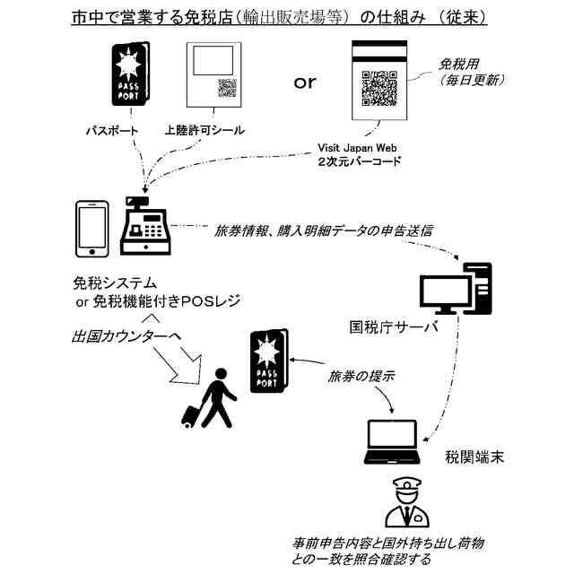 外国人旅行者は入国時に「上陸許可シール」という証印が日本政府によりパスポートに貼付される。旅行者は、パスポートおよびパスポートに添付された「上陸許可シール」を免税店に提示する。免税店は、それら旅券情報および購入品内容をもとに免税可否を判定し、可の場合には旅行者は購入時の消費税支払いを免除される。その際、輸出物品販売場は、パスポートや在留資格のデータと購入品データを国税庁サーバへデータ送信(報告)する、という手続きを義務づけられている。