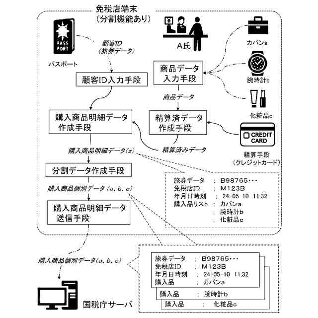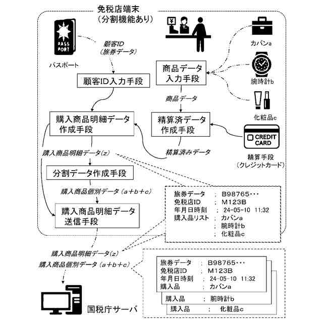【解決手段】 商品購入者を特定するための顧客IDを入力する顧客ID入力手段と、商品購入者が購入しようとしている商品に付された商品データを読み込む商品バーコードリーダと、その商品データに基づく購入金額を精算するための精算用データを入力して精算済みデータを作成するクレジットカードリーダと、顧客IDを精算済みデータに紐付けて購入商品明細データを作成する購入商品明細データ作成手段と、購入商品明細データを商品データ毎に分割して購入商品個別データ(a,b,c)を作成する分割データ作成手段と、購入商品個別データを国税庁サーバへ送信する購入商品明細データ送信手段と、を備えた免税店端末を提供する。
