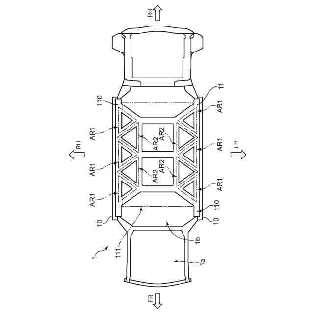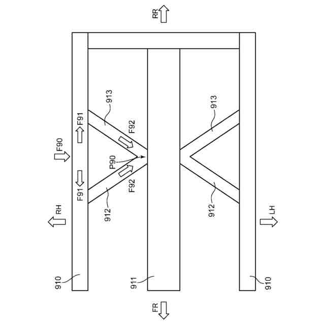 一対の第1クロスメンバ912のそれぞれは、車幅方向内側の端部がフロアトンネル911に接合され、車幅方向外側へと行くのに従って斜め前方に延びるように形成されるとともに、車幅方向外側の端部がサイドシル910に接合されている。一対の第2クロスメンバ913のそれぞれは、車幅方向内側の端部がフロアトンネル911に接合され、車幅方向外側へと行くのに従って斜め後方に延びるように形成されるとともに、車幅方向外側の端部がサイドシル910に接合されている。