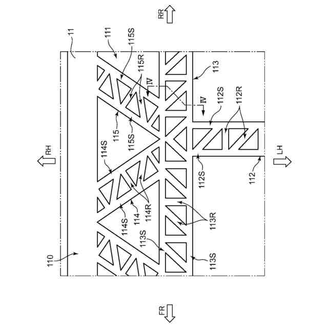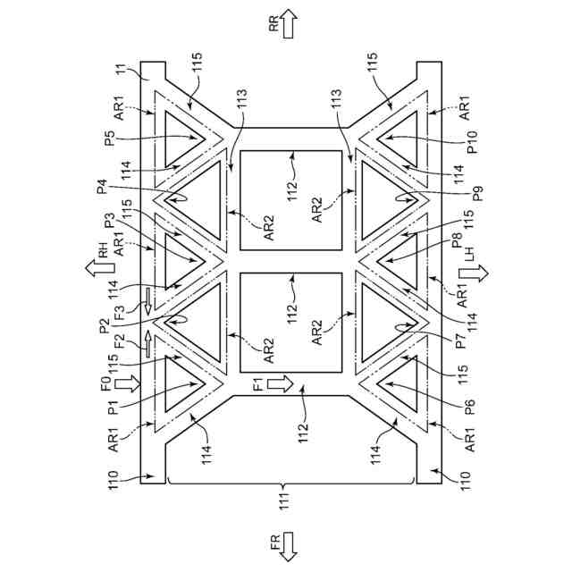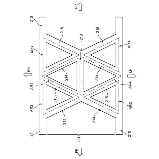 【解決手段】骨格部材11は、一対の側梁部110と内側骨格部111とを備える。内側骨格部111は、それぞれが車幅方向内側から車幅方向外側へと行くのに従って前方へと延びるように形成された複数の第1斜梁部位114と、それぞれが車幅方向内側から車幅方向外側へと行くのに従って後方へと延びるように形成された複数の第2斜梁部位115と、を有する。骨格部材11は、それぞれが側梁部110と前後方向に隣り合う第1斜梁部位114および第2斜梁部位115とで構成され、車幅方向の両側で前後方向に連続するように構成された複数の三角構造部AR1を有する。
