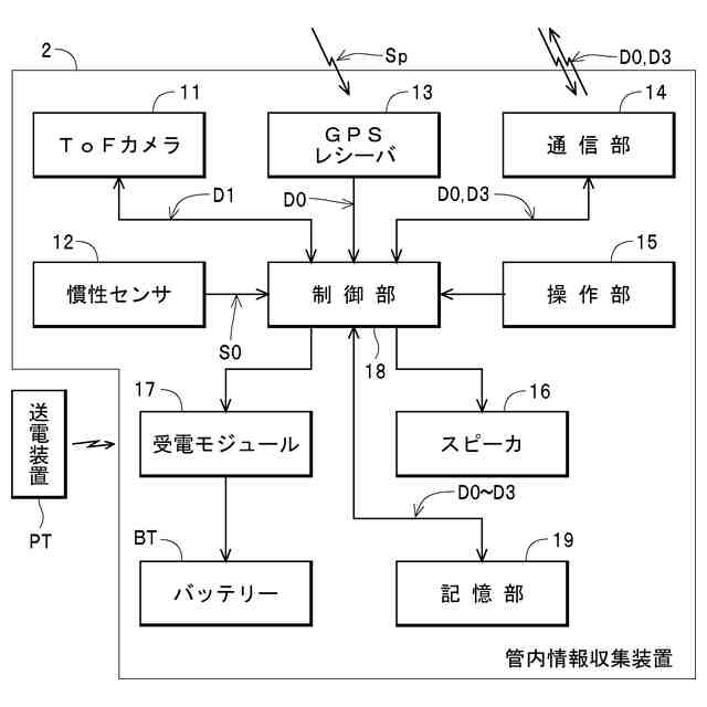 【解決手段】ToFカメラ11、慣性センサ12、制御部18および記憶部19を備えると共に、これらが防水構造のケーシング内に収容され、制御部18が、慣性センサ12から出力されるセンサ信号S0に基づいてToFカメラ11の姿勢および移動速度を特定可能な慣性データD2を生成し、生成した慣性データD2とToFカメラ11による位置データD0とを相互に関連付けて記憶部19に記憶させる情報収集処理を実行可能に構成され、情報収集対象の配管内を配水と共に移動可能に構成されている。