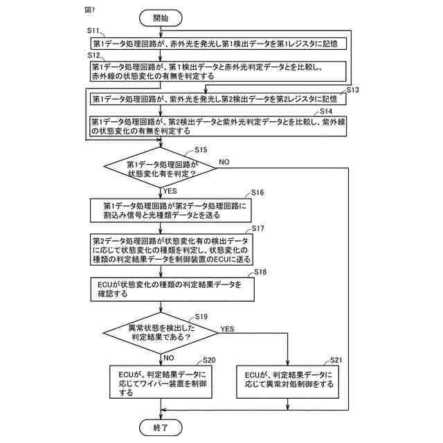 【解決手段】赤外光に応じた第1反射光を受光する第1受光素子11bからの第1検出信号を第1検出データに変換し、第1検出データに応じて雨を検出するための第1データ処理をする第1データ処理回路2と、赤外光を用いる雨の検出に関する異常状態が生じているか否かを判定するための第2データ処理をする第2データ処理回路3とを備える。第1データ処理回路2は、さらに、紫外光に応じた第2反射光を受光する第2受光素子12bからの第2検出信号を第2検出データに変換する。第2データ処理回路3は、第2データ処理において、赤外光を用いる雨の検出に関する異常状態が生じているか否かを第2検出データに応じて判定する。