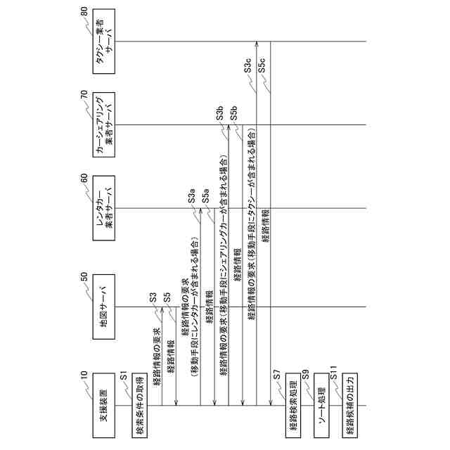 【解決手段】支援方法では、支援装置10は、複数の移動手段を利用して出発地から目的地に到達する複数の経路候補を検索する。支援装置10は、当該複数の経路候補をソートする基準として、疲労に関する項目が設定されている場合、当該複数の経路候補のうち、疲労に関するスコアが最小になる経路候補と、移動時間又は移動距離が最小になる経路候補とを出力する。