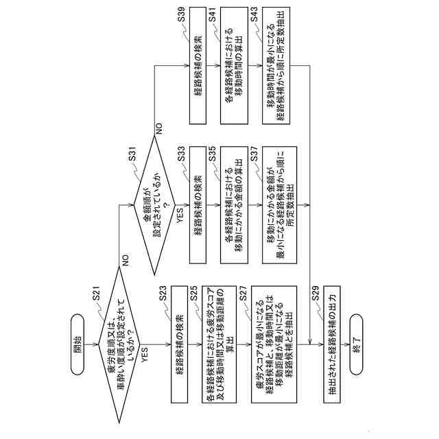 これらのニーズに応えるためには、ユーザの疲労軽減を考慮しつつ、複数の移動手段を利用して出発地から目的地に到達する経路候補を複数提示し、ユーザが、各径路候補の優位性を比較し得る必要がある。