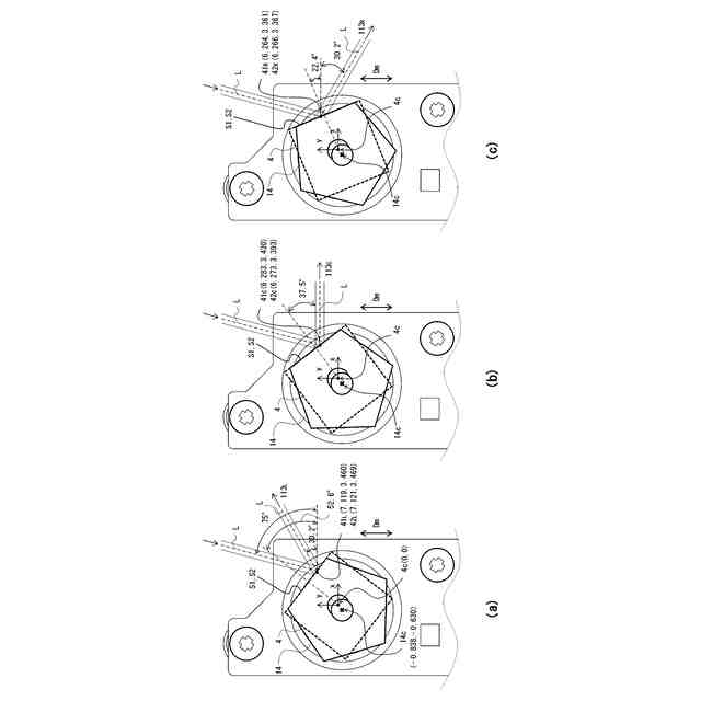 (2)光源と、前記光源が出射したレーザ光束を集光させる入射レンズと、前記入射レンズを通過した前記レーザ光束を偏向走査する回転多面鏡と、前記回転多面鏡と一体で前記回転多面鏡を回転駆動する偏向器と、前記回転多面鏡で偏向されたレーザ光束を被走査面に対して走査するための走査レンズと、前記光源、前記入射レンズ、前記回転多面鏡、前記偏向器、及び、前記走査レンズを収容する光学箱と、を備える走査光学装置であって、前記偏向器は、前記回転多面鏡の回転軸と同軸に位置する同軸部を有し、前記光学箱は、前記同軸部の軸方向に直交する平面内における少なくとも一方向を規制し、前記平面内において前記一方向と直交する方向である他方向は規制していない点対称の穴形状部を有し、前記光源から前記回転多面鏡に向けて出射されるレーザ光束である入射レーザ光束と、前記回転多面鏡で反射され前記被走査面の書き始め位置に到達するレーザ光束が前記走査レンズに入射する前のレーザ光束と、の第1二等分線と、前記入射レーザ光束と、前記回転多面鏡で反射され前記被走査面の書き終わり位置に到達するレーザ光束が前記走査レンズに入射する前のレーザ光束と、の第2二等分線と、の交点を基準としたとき、前記穴形状部の長手方向は、前記交点と前記回転多面鏡の回転方向における前記第1二等分線から前記第2二等分線までの間の領域に位置する点とを結ぶ仮想線の方向となっていることを特徴とする走査光学装置。
