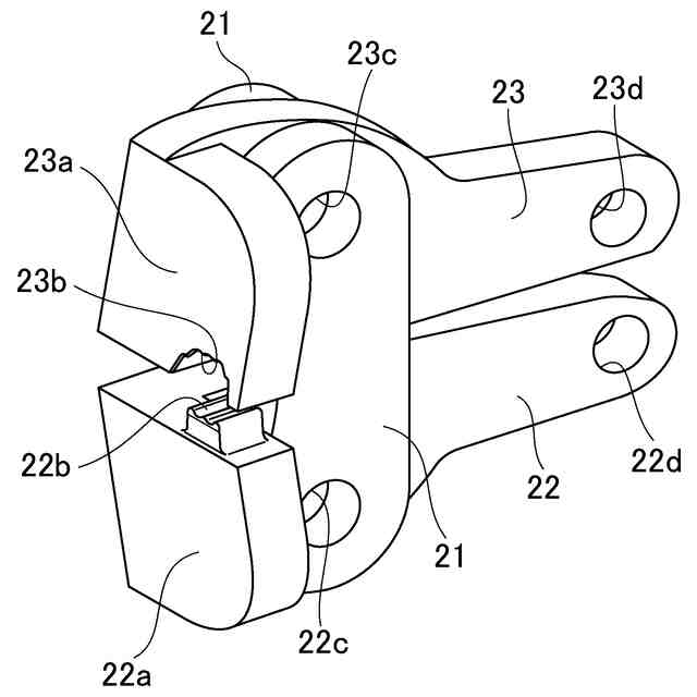 また、特許文献2には、一端から他端に至る一対の把持部材と、一対の把持部材同士を回動可能に連結する枢着部と、基端から先端に至る一対の挟持部材と、一対の挟持部材同士を基端と先端との間の中ほどで支持する支持部とを備え、一方の挟持部材は、他端側が一方の把持部材に対して回動自在に接続され、他方の挟持部材は、他方の把持部材に対して不動に固定され又は他方の把持部材と一体の部材で形成され、一対の把持部材の一端同士を近づけることにより、一対の挟持部材の先端に設けられたダイス部同士が互いに接近するようにした圧着ダイス及び圧着工具が記載されている。