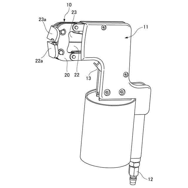 1対の歯口部が直線状に運動して互いに咬合しカシメを行う圧着ダイスを備えた圧着工具も存在するが、作業者が手持ちで圧着作業をすることができる圧着工具においては、アームの回動運動を直線運動に無理やり変換しているため、充分なカシメ力で圧着することが難しく、また、構造が複雑である。1対の歯口部が直線状に運動して互いに咬合しカシメを行う備え付けの圧着装置も存在するが、備え付けであることから、重量が重いので操作性が悪く打ち損じが起き易いこと、生産性が悪いこと、高価であることなど、種々の問題点を有している。