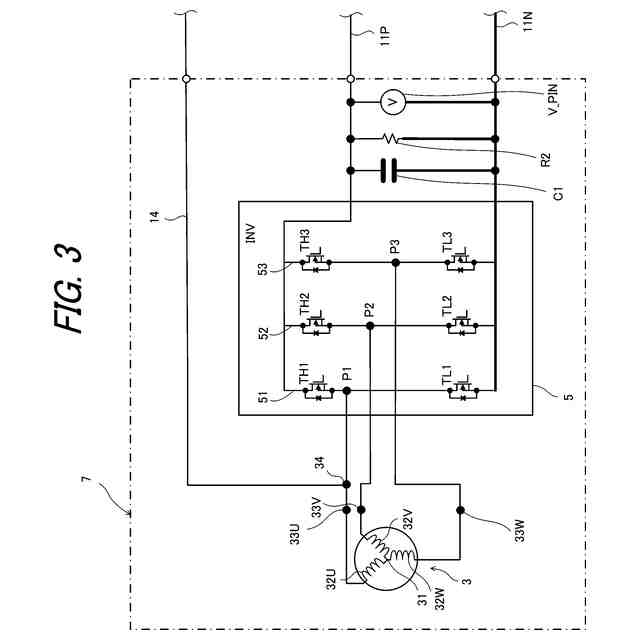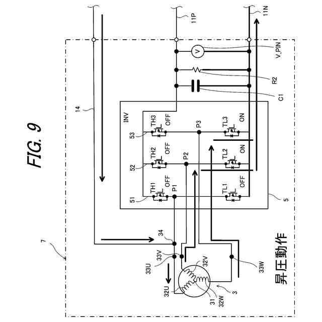 3相のコイルが中性点で接続され、前記バッテリから供給される電力で駆動する三相モータと、