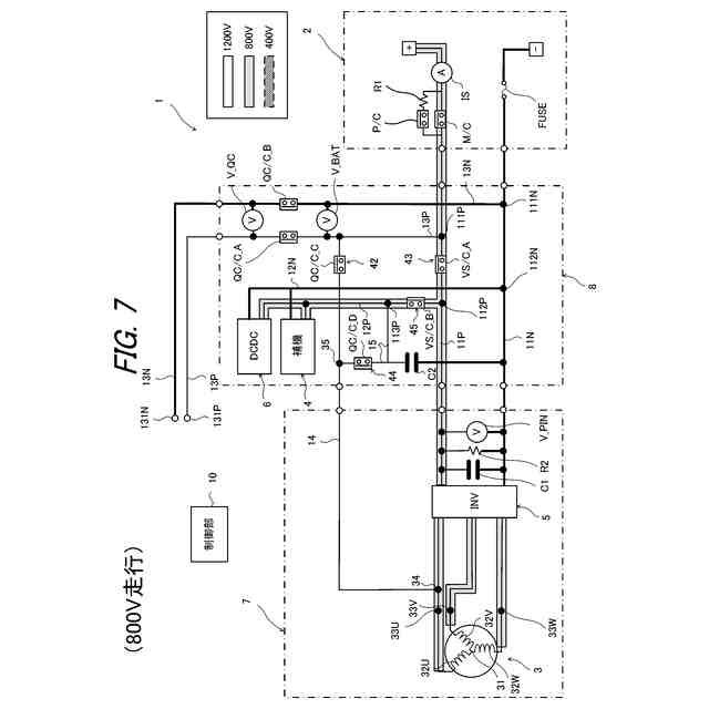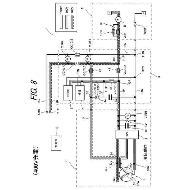 モビリティが400V級及び800V級の充電設備に対応している場合、一般的に、400V級の充電設備で充電する際に電圧変換器で800Vに昇圧して充電するか、800V級の充電設備で充電する際に電圧変換器で400Vに降圧して充電する。しかしながら、充電時に充電用の電圧変換器を通すと効率が悪化してしまう。