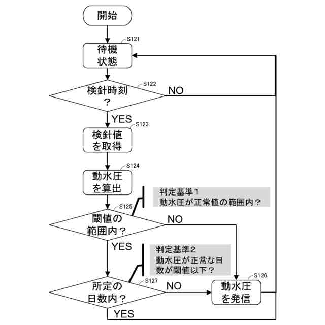 あるいは、本発明の別の態様に従うと、流量を測定するための測定部と、センタと通信するための通信部と、流量から動水圧を計算して、通信部を介して動水圧をセンタに送信するための制御部と、を備える水道メータが提供される。