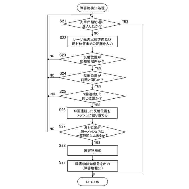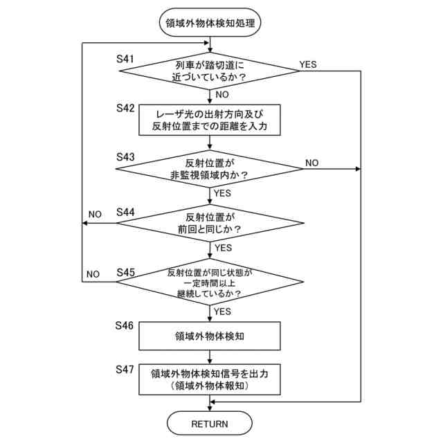 踏切に設置された踏切保安装置が動作していないときに前記レーザ光の反射位置が前記非監視領域内にある否かを判定する、