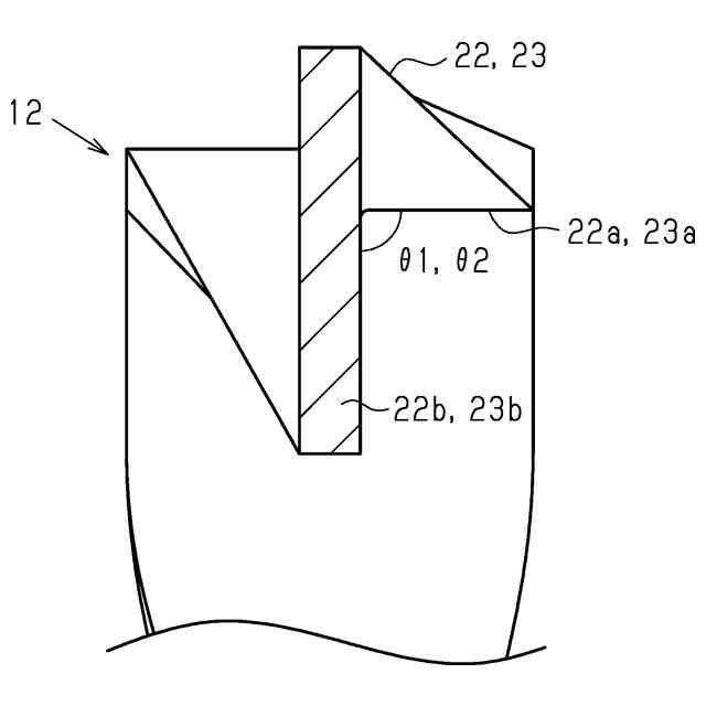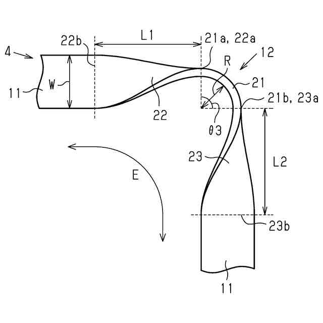 前記第1内側端部に対する前記第1外側端部の第1捻じり角度、及び、前記第2内側端部に対する前記第2外側端部の第2捻じり角度は、90°以下である